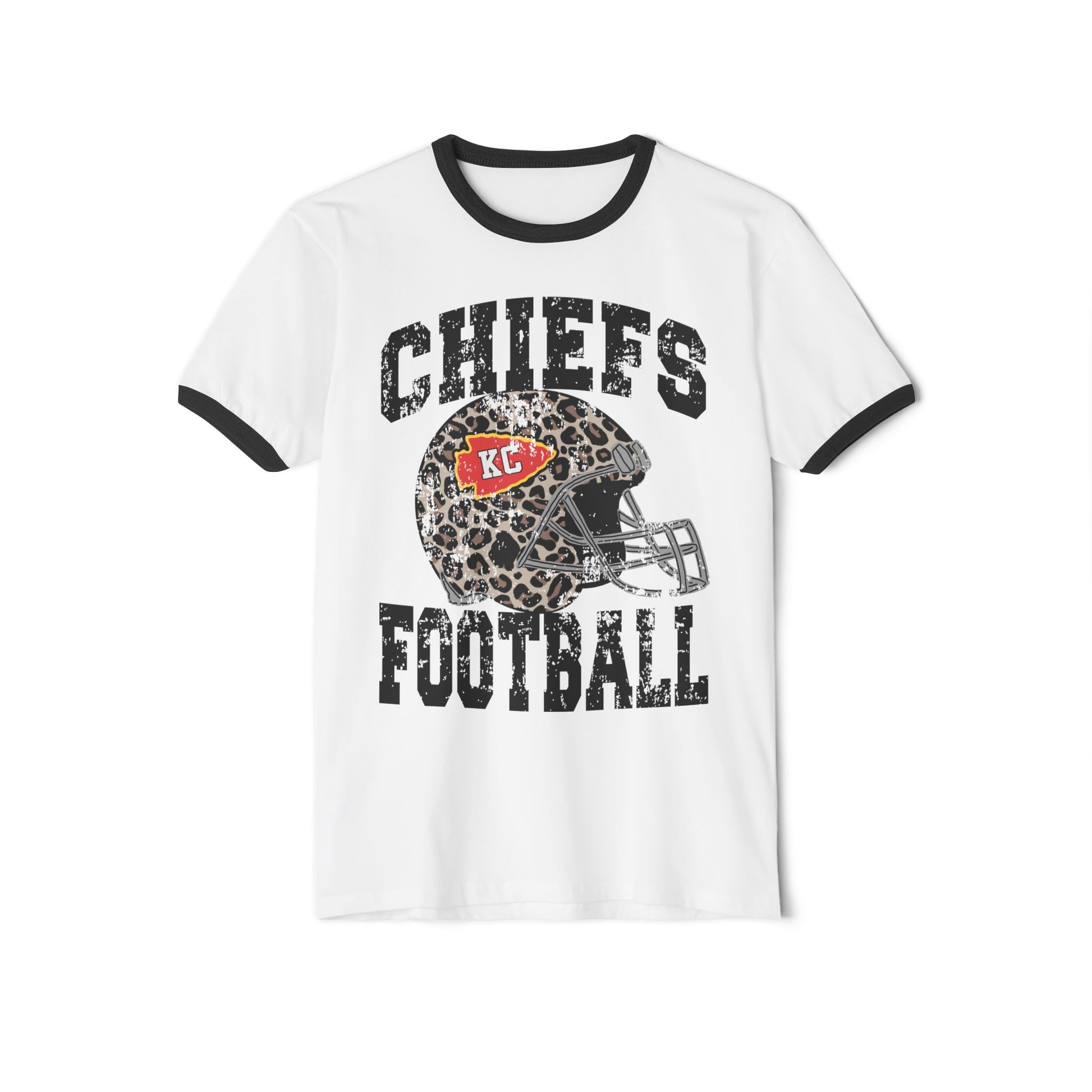Game-day edge with a retro twist! Leopard helmet graphic + black ringer accents for a bold fan look.