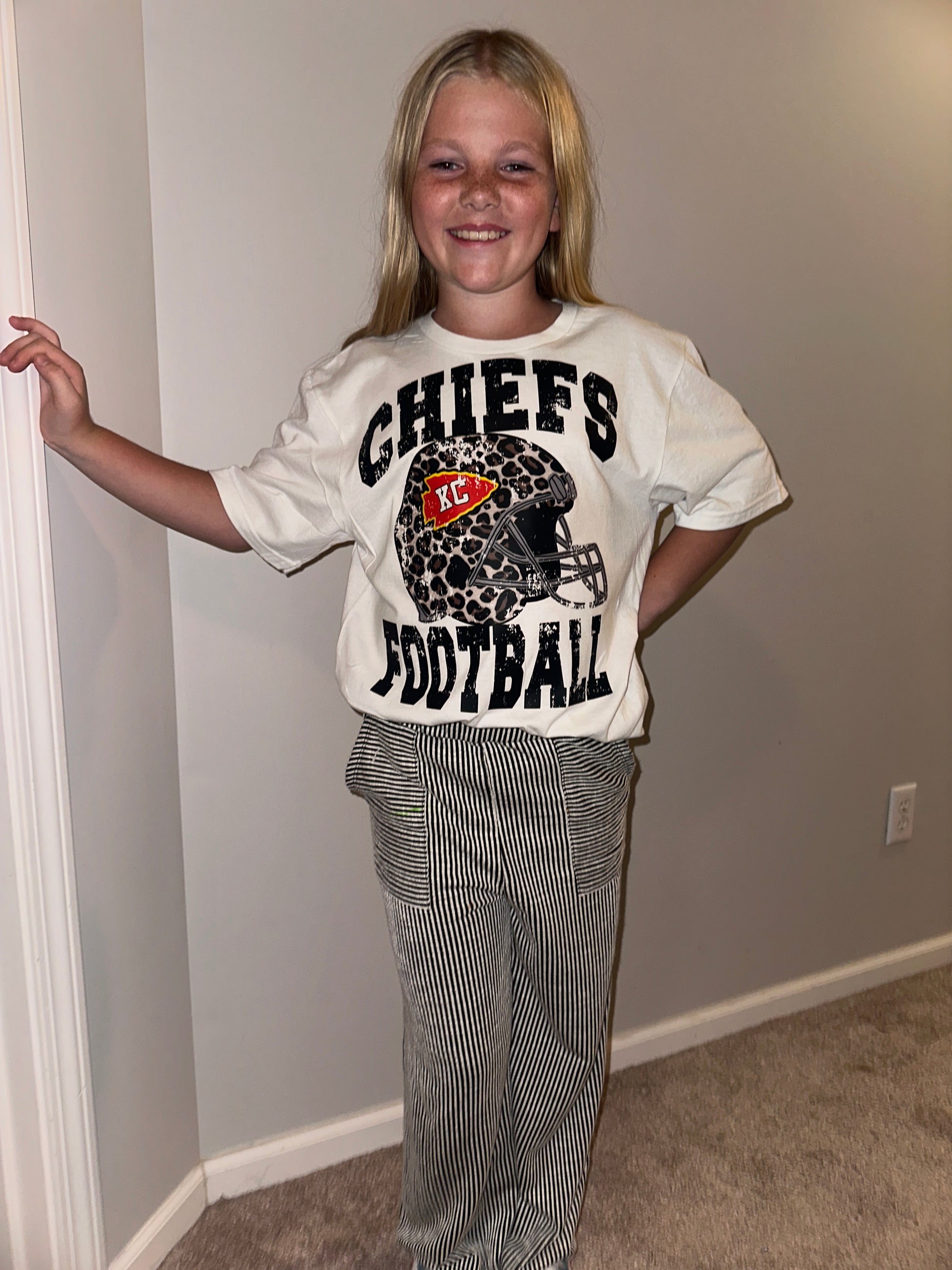 Bold Chiefs football graphic tee with a leopard print helmet and distressed lettering